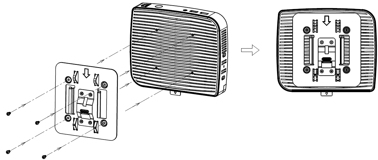 → Befestigen Sie die Monitorplatte der VESA-Halterung mit den Schrauben an der Rückseite Ihres Monitors und achten Sie dabei auf die korrekte Ausrichtung.
