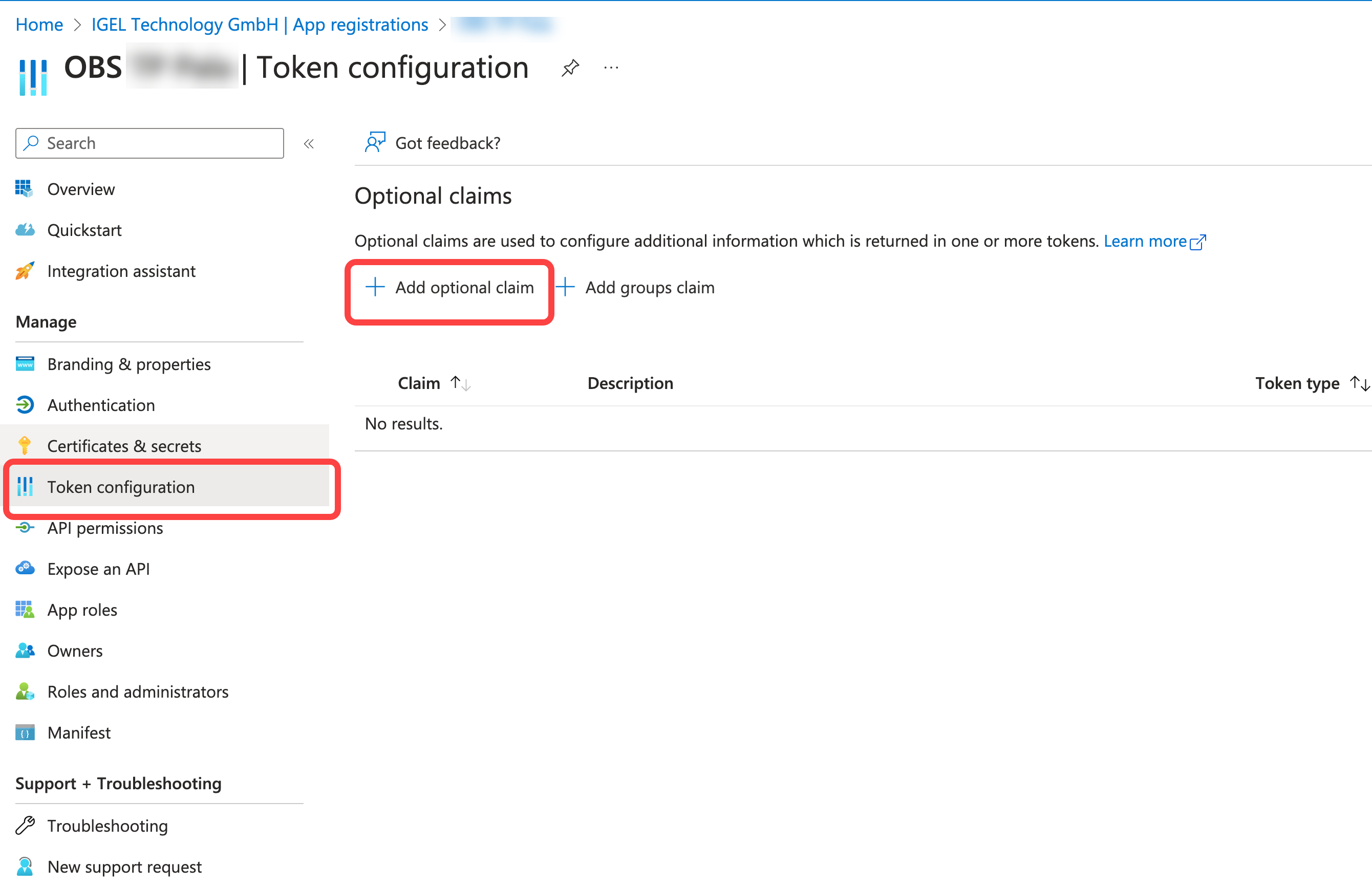 Klicken Sie auf Token configuration und dann auf Add optional claim.