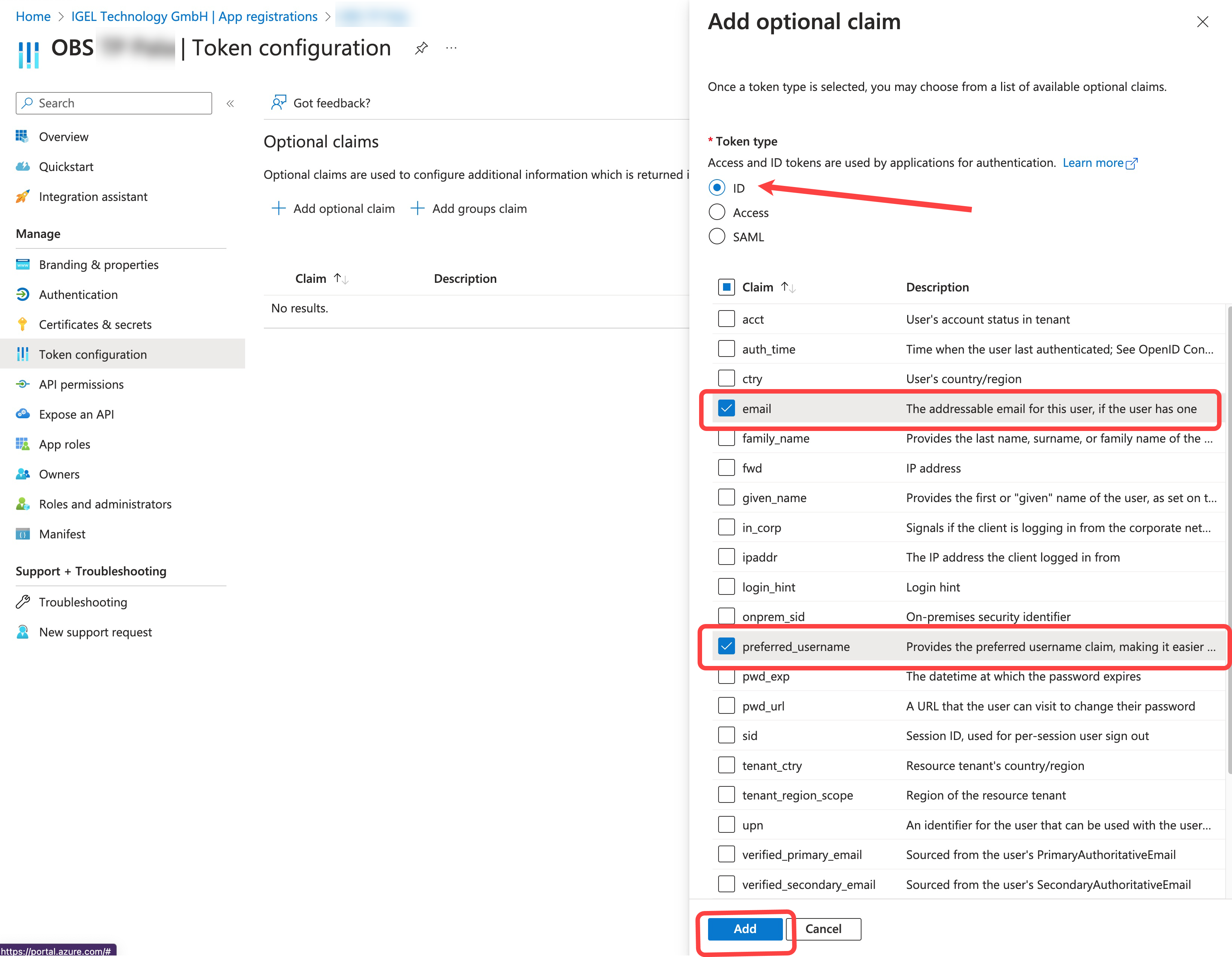 Im Fenster Add optional claim wählen Sie unter Token type die ID und aktivieren Sie diese:
