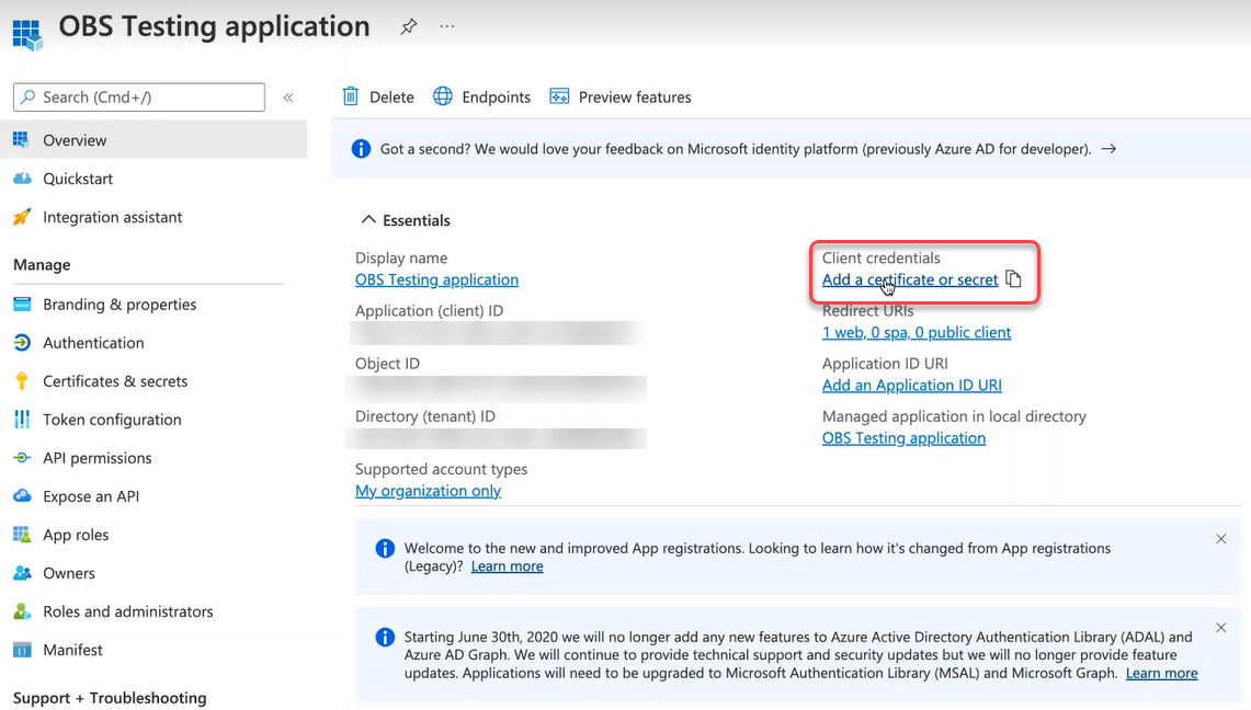 Wechseln Sie zur Registerkarte mit Ihrer Entra-App (Overview) und klicken Sie auf Add a certificate or secret.