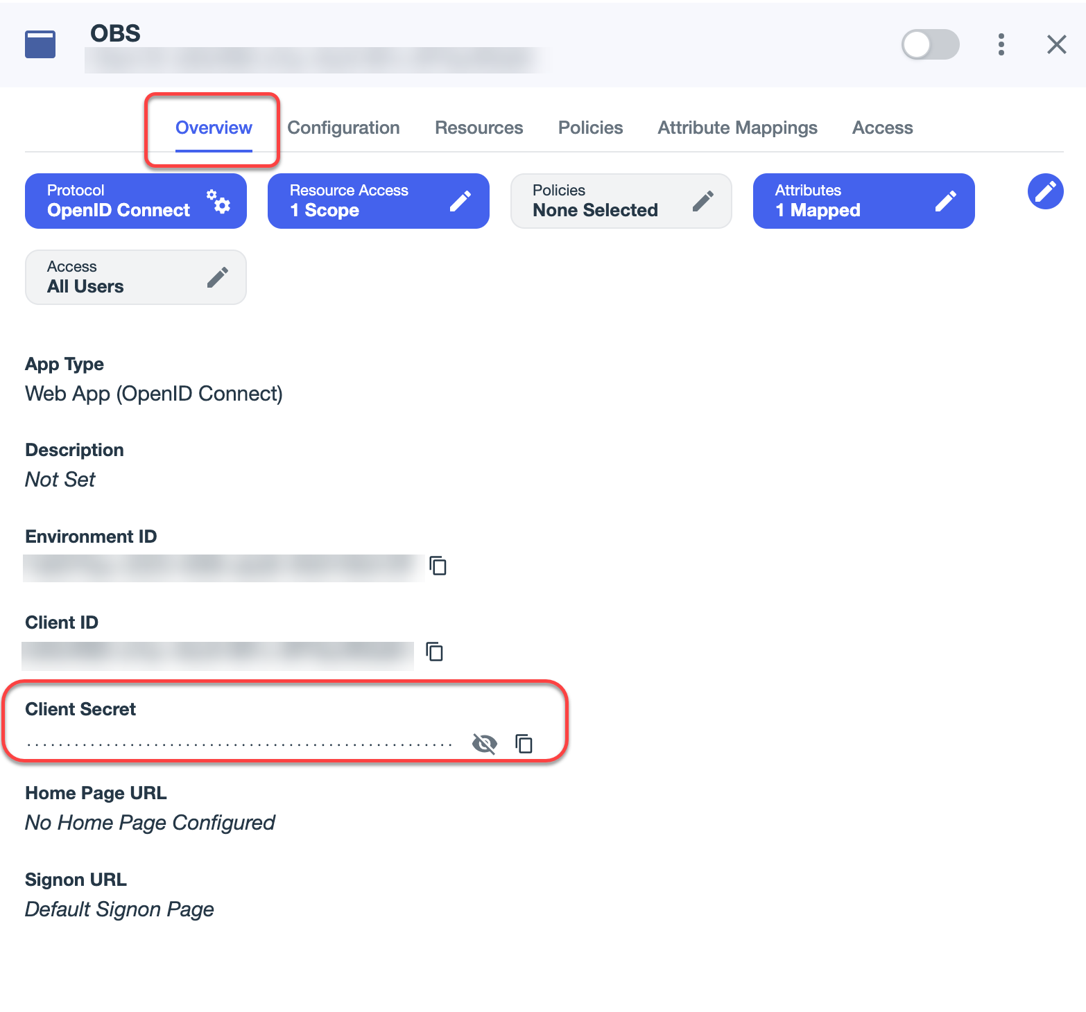 Wechseln Sie zur Registerkarte mit Ihrer Ping-App, gehen Sie auf die Registerkarte Overview und kopieren Sie den Clientschlüssel in Client Secret.