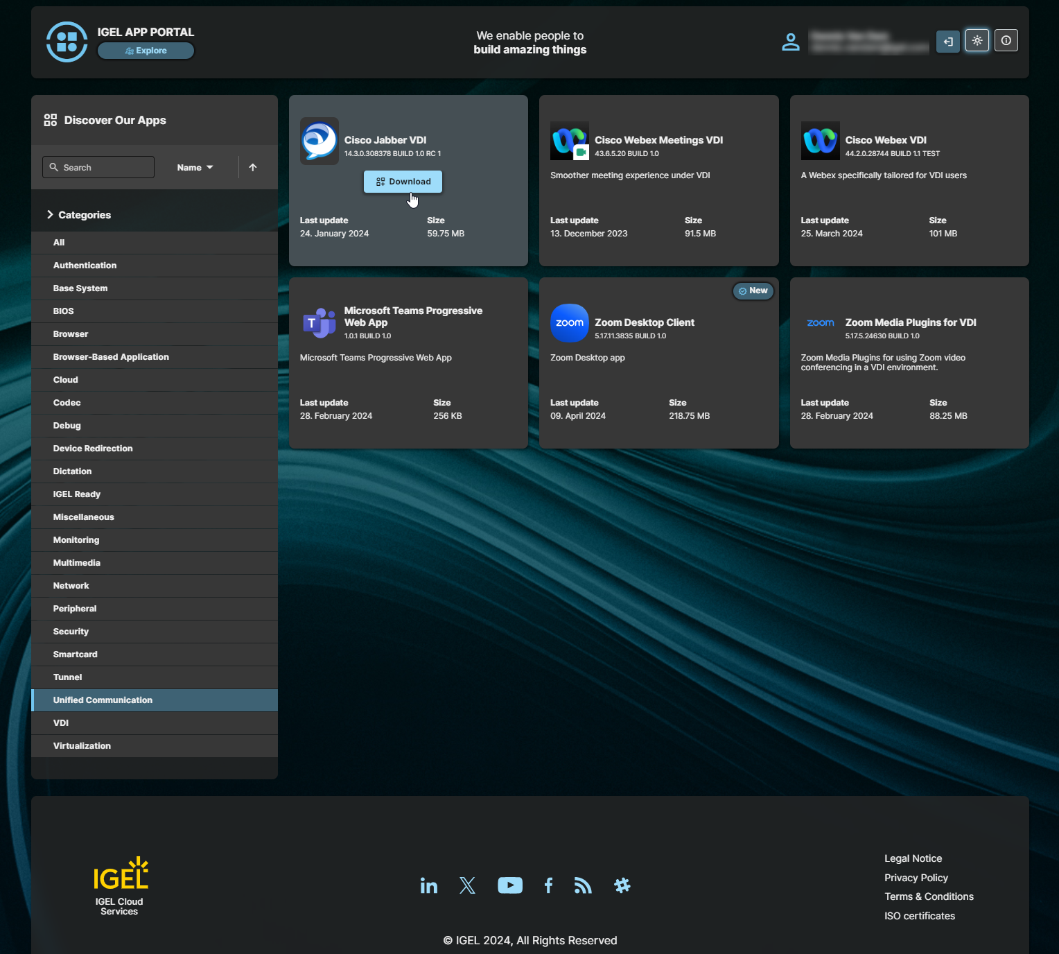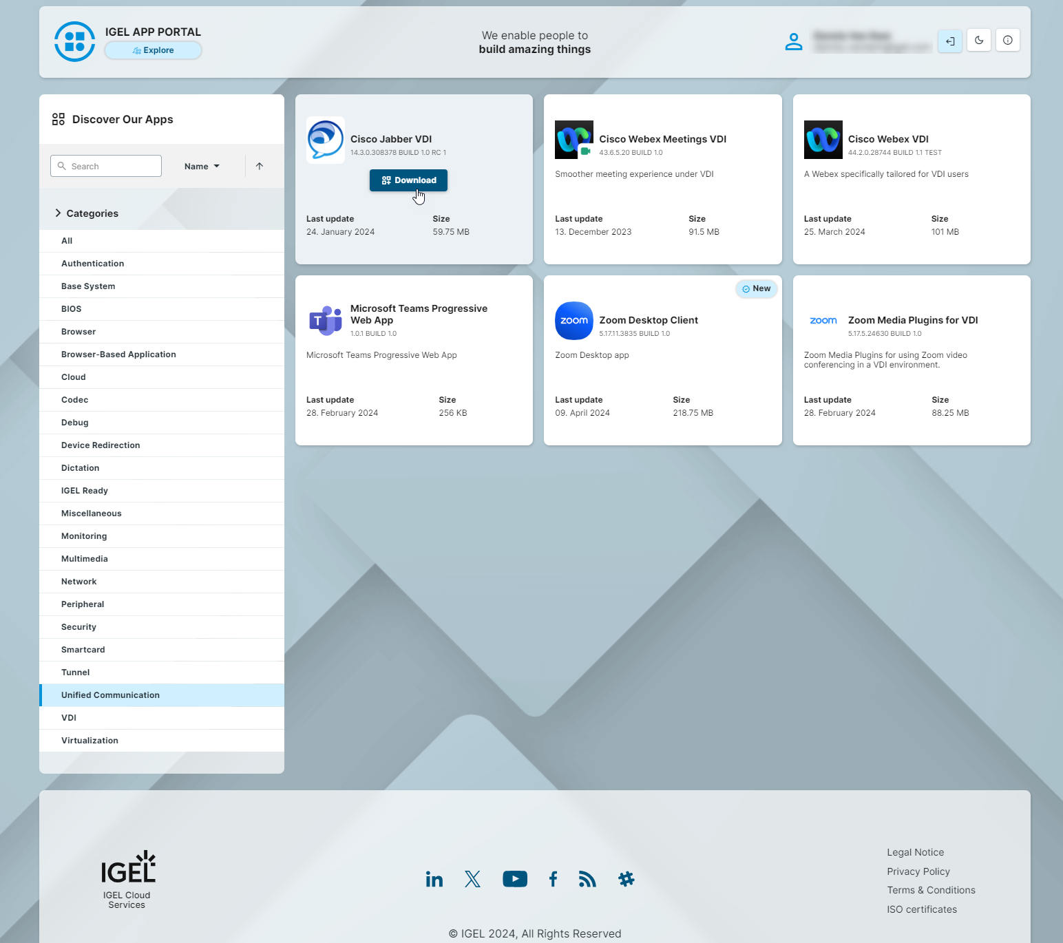 Mit IGEL OS 12 wird ein modulares Prinzip eingeführt - Sie können einzelne Anwendungen individuell installieren und aktualisieren wie Citrix oder AVD-Client, Chromium-Browser, etc. Sie finden alle derzeit für IGEL OS 12 verfügbaren Anwendungen im IGEL App Portal, zusammen mit den entsprechenden Changelogs / Release Notes.