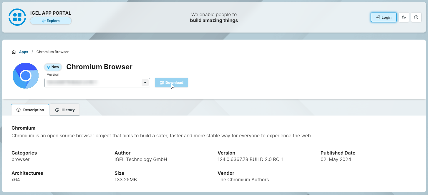 Sie können auf die Karte klicken, um die Detailansicht der App zu öffnen. Hier finden Sie die grundlegenden Informationen unter Description und das Änderungsprotokoll unter History.