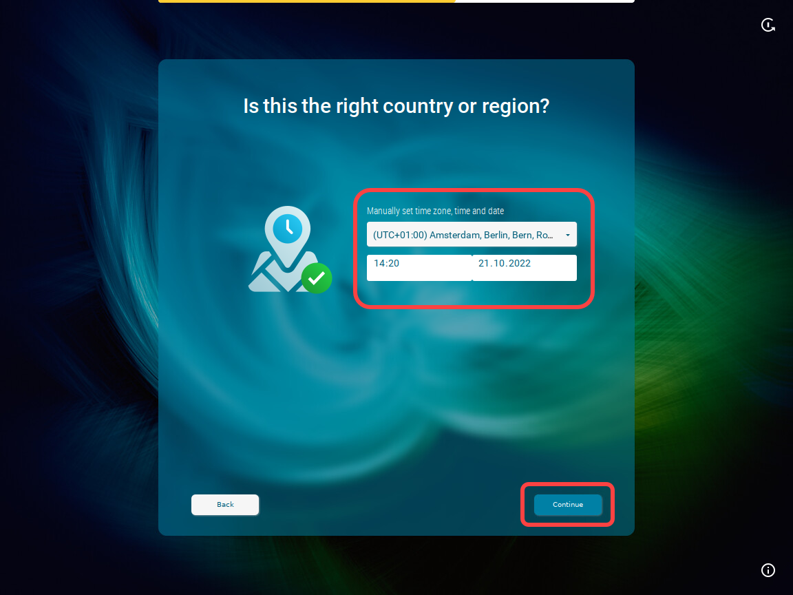 Oder klicken Sie auf Continue und stellen Ihre Zeitzone, die Uhrzeit und das Datum manuell ein und klicken dann auf Continue.