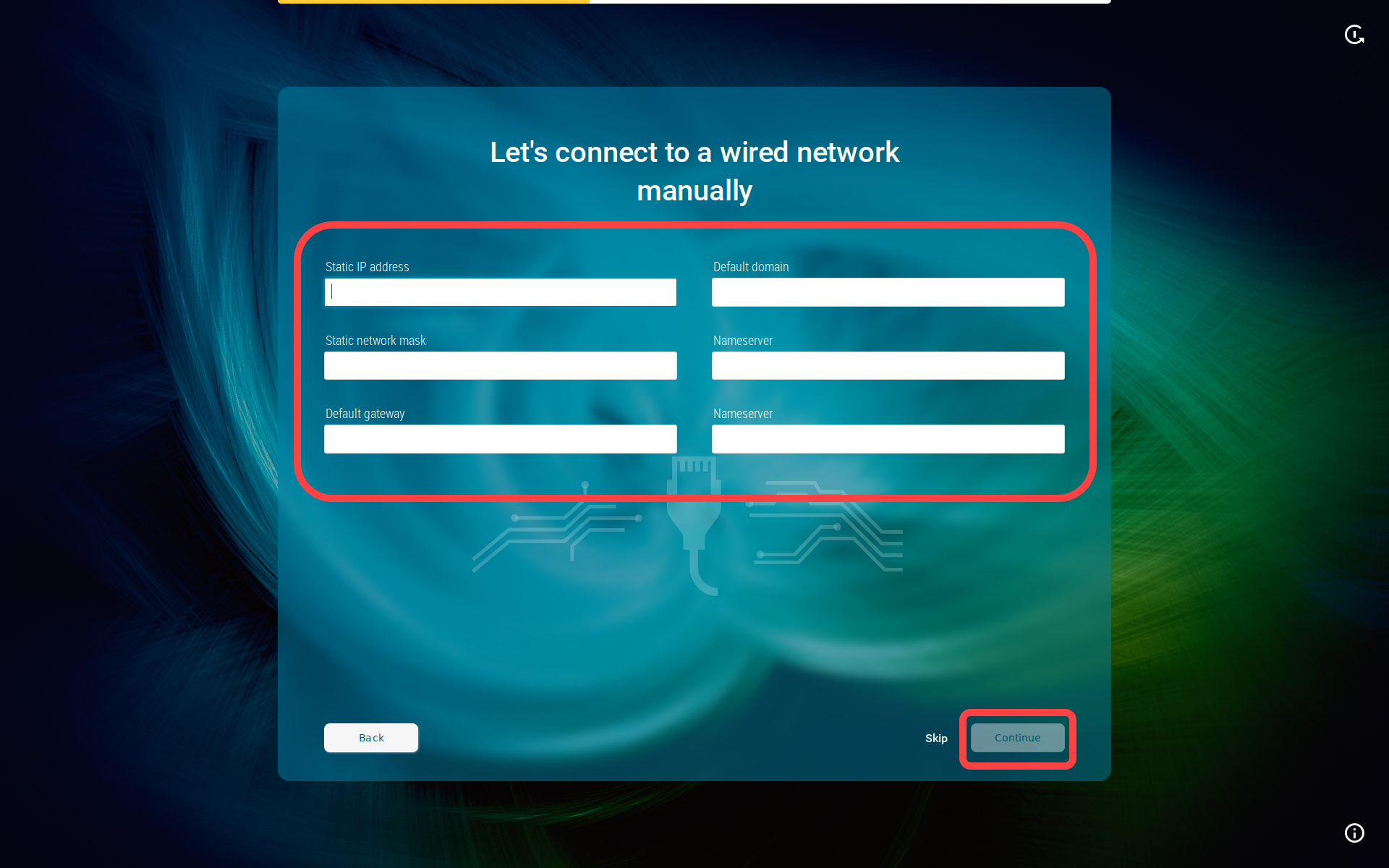 Dieser Konfigurationsschritt ist verfügbar, wenn ein kabelgebundenes Netzwerk erkannt wurde, die Verbindung zum LAN aber nicht automatisch hergestellt werden konnte (z. B. weil die IP-Adresse aus irgendeinem Grund nicht automatisch vom DHCP-Server bezogen werden konnte).