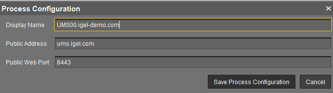 Wenn die Änderung des Hostnamens Ihres Servers nicht erlaubt ist, dann können Sie den Anzeigenamen (Display Name) und die Öffentliche Adresse (Public Address) Ihres UMS Servers ändern: