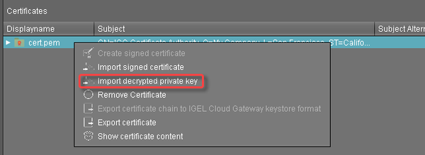 Klicken Sie mit der rechten Maustaste auf das CA-Root-Zertifikat und wählen Sie Entschlüsselten privaten Schlüssel importieren.