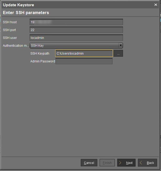 Wenn Sie SSH-Schlüssel als Authentifizierungsmethode verwenden, geben Sie den SSH-Schlüsselpfad und das Admin-Passwort (das sudo-Passwort) ein.
