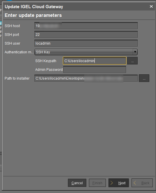 Der Aktualisierungsassistent öffnet sich.Geben Sie die folgenden Update-Parameter ein: