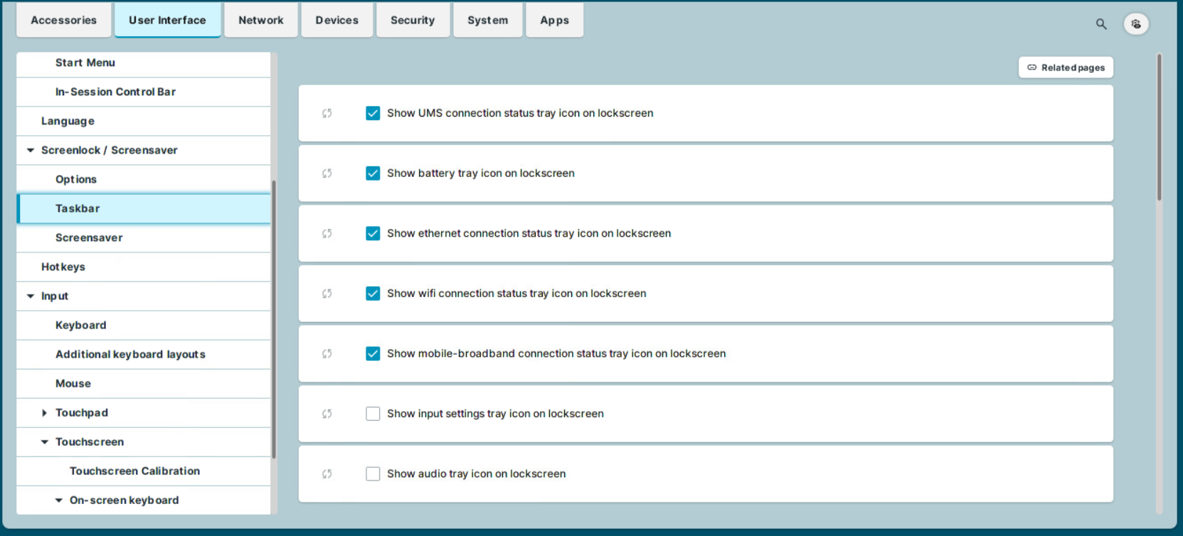 Mit den folgenden Parametern können Sie den Zugriff auf Tray-Anwendungen bei gesperrtem Bildschirm aktivieren/deaktivieren. Die Parameter für den Desktop (zu finden unter Benutzeroberfläche > Desktop > Taskleistenelemente) und die Parameter für den Sperrbildschirm sind unabhängig voneinander. Sie müssen die Symbole für beide Anwendungsfälle separat aktivieren/deaktivieren. Weitere Informationen finden Sie unter Authentifizierung in IGEL OS 12 und Taskleistenelemente in IGEL OS 12.