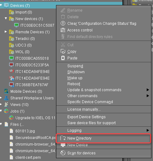Wenn Sie nicht bereits bei der Einrichtung der automatischen Lizenzbereitstellung (ALD) ein Verzeichnis als Verteilungsbedingung angelegt haben: Legen Sie im Knoten Geräte des UMS-Strukturbaums ein Verzeichnis an und nennen Sie es z. B. "Upgrade to IGEL OS 11". Weitere Informationen zu den Verteilungsbedingungen finden Sie unter https://kb.igel.com/en/igel-subscription-and-more/current/how-to-configure-the-distribution-conditions-of-li#HowtoConfiguretheDistributionConditionsofLicenses-DistributingLicensestoDevicesinaSpecifiedDirectoryDistributing-Licenses-to-Devices-in-a-Specified-Directory.