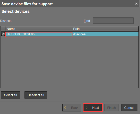Der Dialog Gerätedateien für den Support speichern öffnet sich.Wählen Sie das betreffende Gerät und klicken Sie auf Weiter.