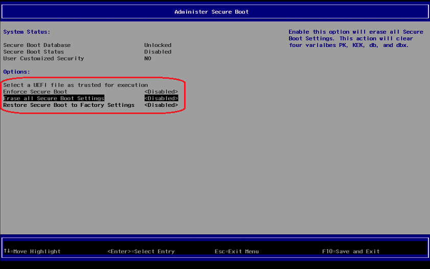 In the screen Administer Secure Boot, you will find Erase all Secure Boot Settings and Restore Secure Boot to Factory Settings set to <Disabled>.
