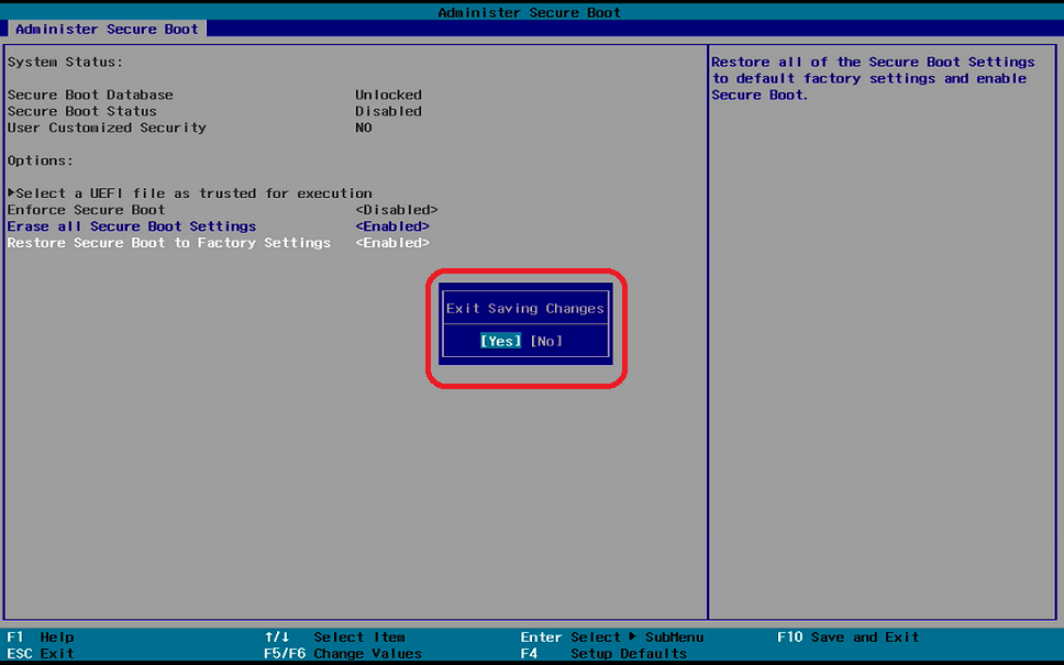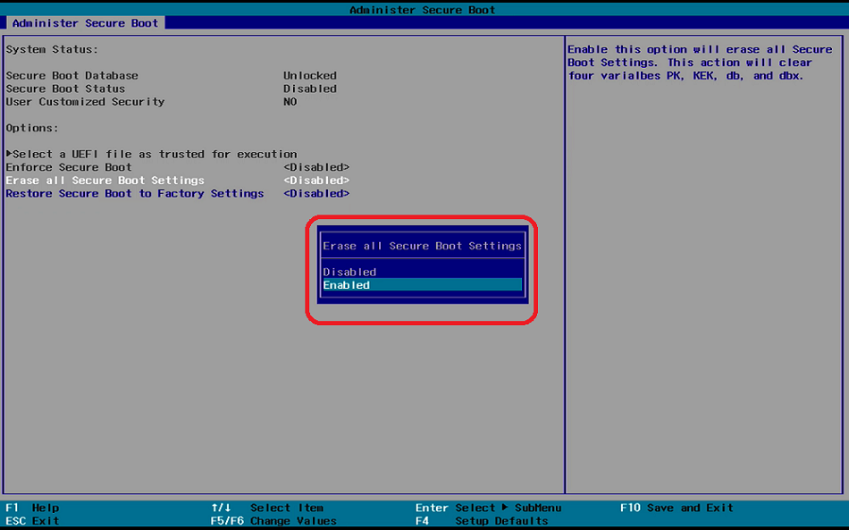 Change both "Erase all Secure Boot Settings" and "Restore Secure Boot to Factory Settings" to <Enabled>.