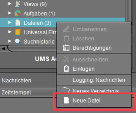 2. Legen Sie in der UMS Konsole unter Dateien per Rechtsklick eine Neue Datei an.