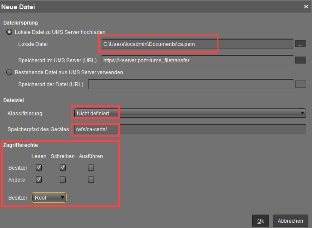 3. Geben Sie bei Speicherpfad des Gerätes /wfs/ca-certs/ ein.