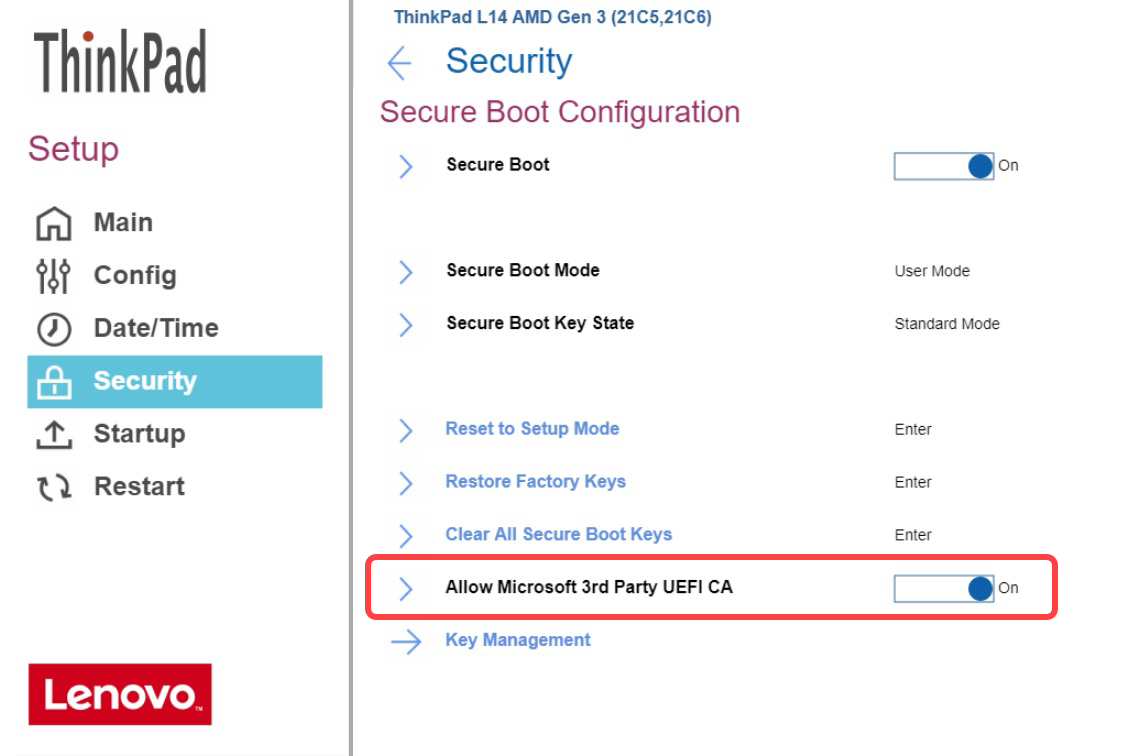 On modern computers such as secured-core PCs (see e.g. https://www.microsoft.com/en-us/windows/business/devices?col=secured-core-pcs), there may be a BIOS setting related to Secure Boot that allows the use of Microsoft’s 3rd party UEFI Secure Boot Certificate. The usual description of such a BIOS setting is "Allow Microsoft 3rd Party UEFI CA". This setting must be set to enabled, as IGEL uses the 3rd party certificate to support UEFI Secure Boot.