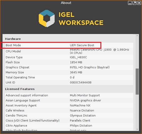 In the IGEL Device Information tool, in the Hardware tab, Boot Mode is set to the value UEFI Secure Boot.