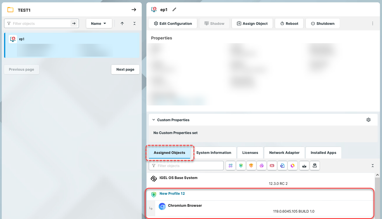 The assigned profile and the app assigned to the device via this profile are displayed under Devices > Assigned Objects.