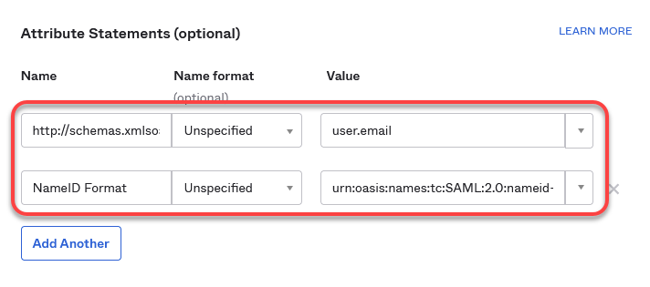 NameID Format; Value:urn:oasis:names:tc:SAML:2.0:nameid-format:persistent