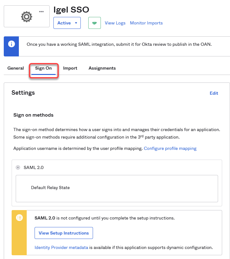 For federating identities from Okta to Azure Active Directory (AAD), which is used in IGEL Cloud Services, you must set up an application integration in your Okta tenant. For this purpose, we will create a SAML 2.0 application.