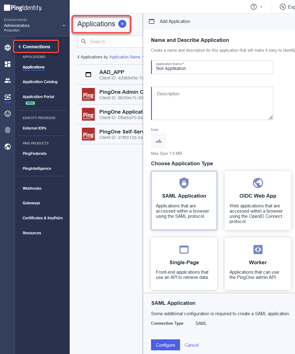 Log in to your account at Ping, go to Connection > Applications, and then add an application.