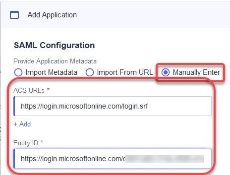 In the SAML Configuration dialog, select Manually Enter and enter the following data:
