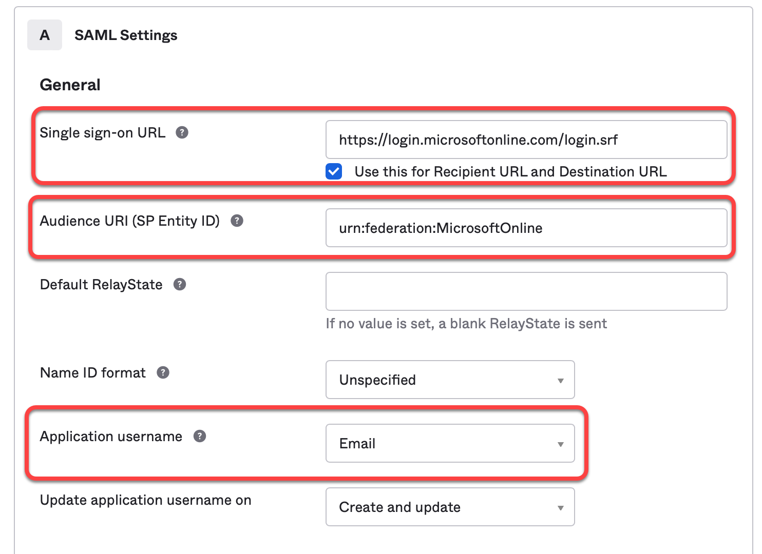 urn:federation:MicrosoftOnlineApplication username: Set this to Email.