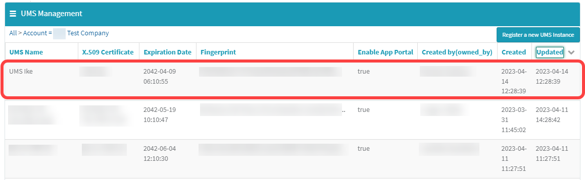 After a few seconds, the new UMS is registered. If you toggle the sorting by Updated, your newly registered UMS should be displayed on top.