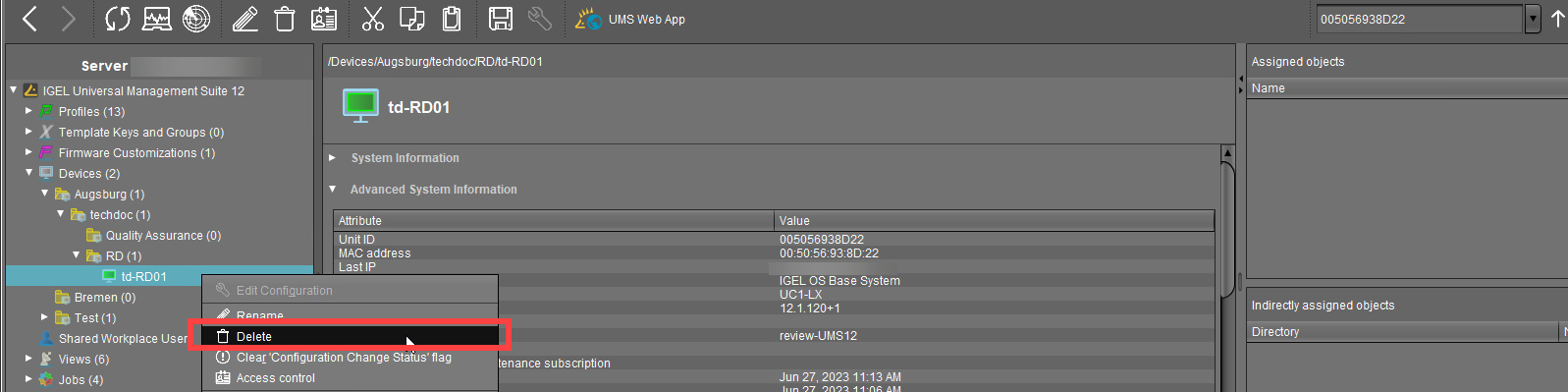 The device will be moved to the recycle bin. See Recycle Bin - Deleting Objects in the IGEL UMS.