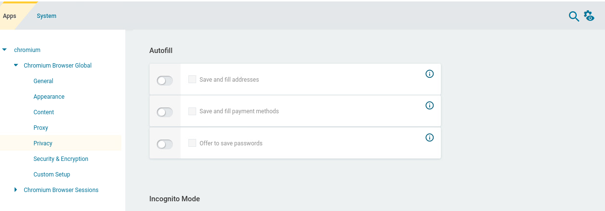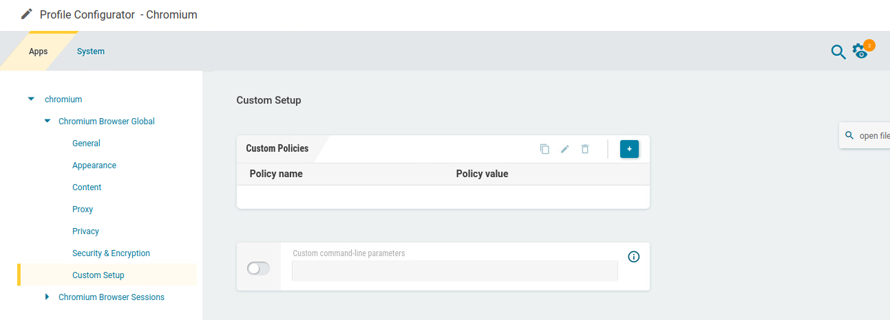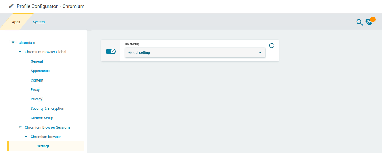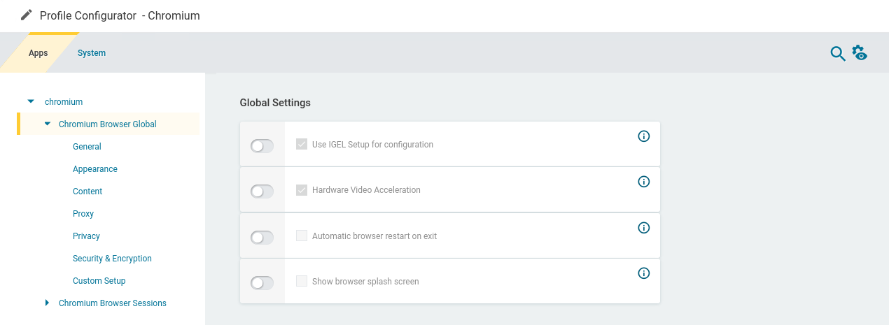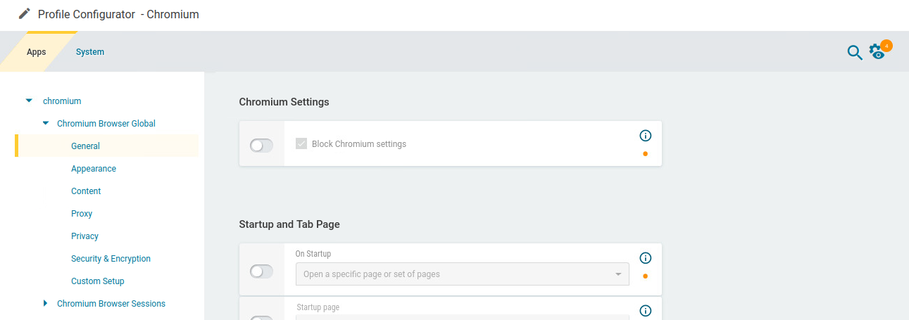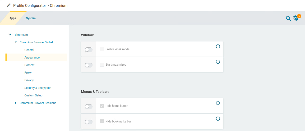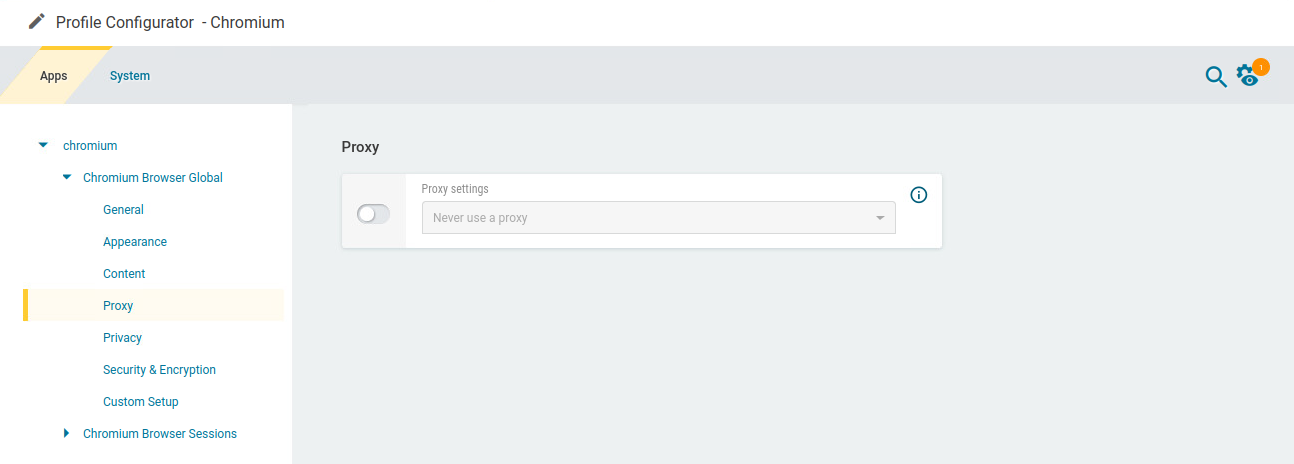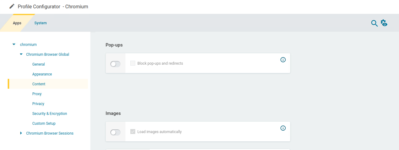 In the profile configurator, go to Apps > Chromium > Chromium Browser Global .