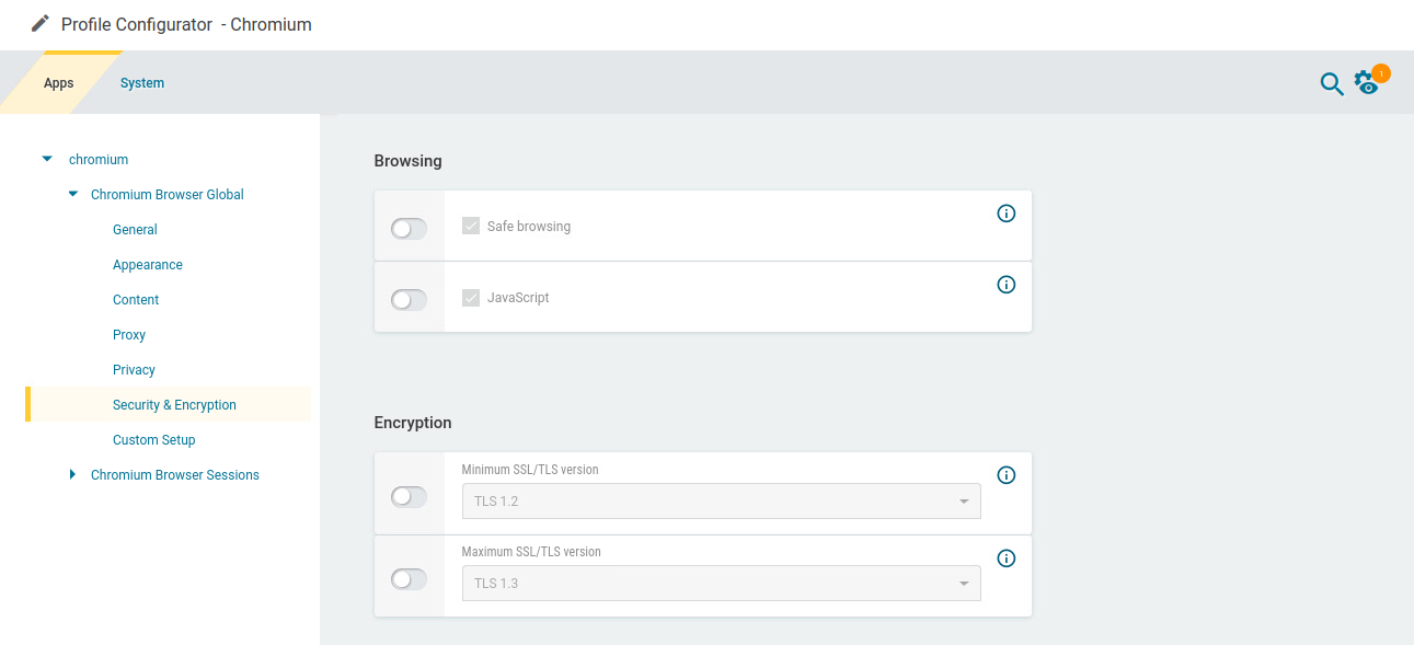In the profile configurator, go to Apps > Chromium > Chromium Browser Global > Security & Encryption.