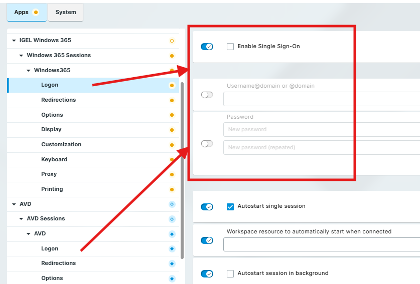Apps > IGEL Windows 365 > Windows 365 Sessions > [session name] > Logon: