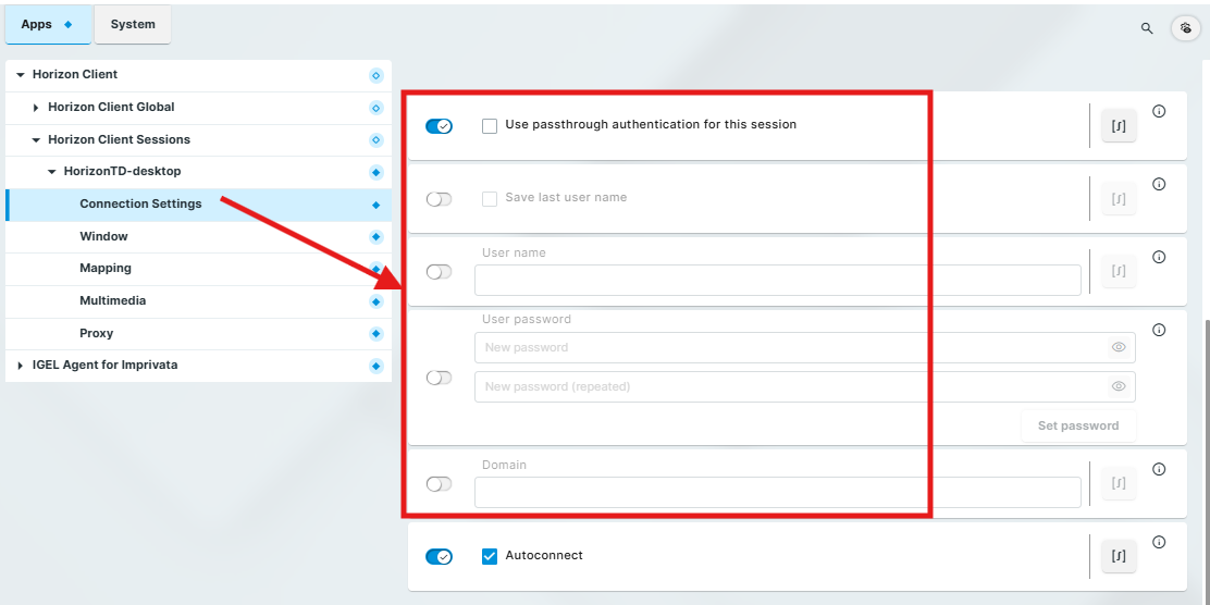 To make the credential stuffing possible, the credentials must not be predefined for the preconfigured session. Therefore set the relevant session credential parameters to inactive so that they are not controlled by the UMS profile.