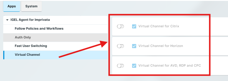 In the profile configurator, go to Apps > IGEL Agent for Imprivata > Virtual Channel.