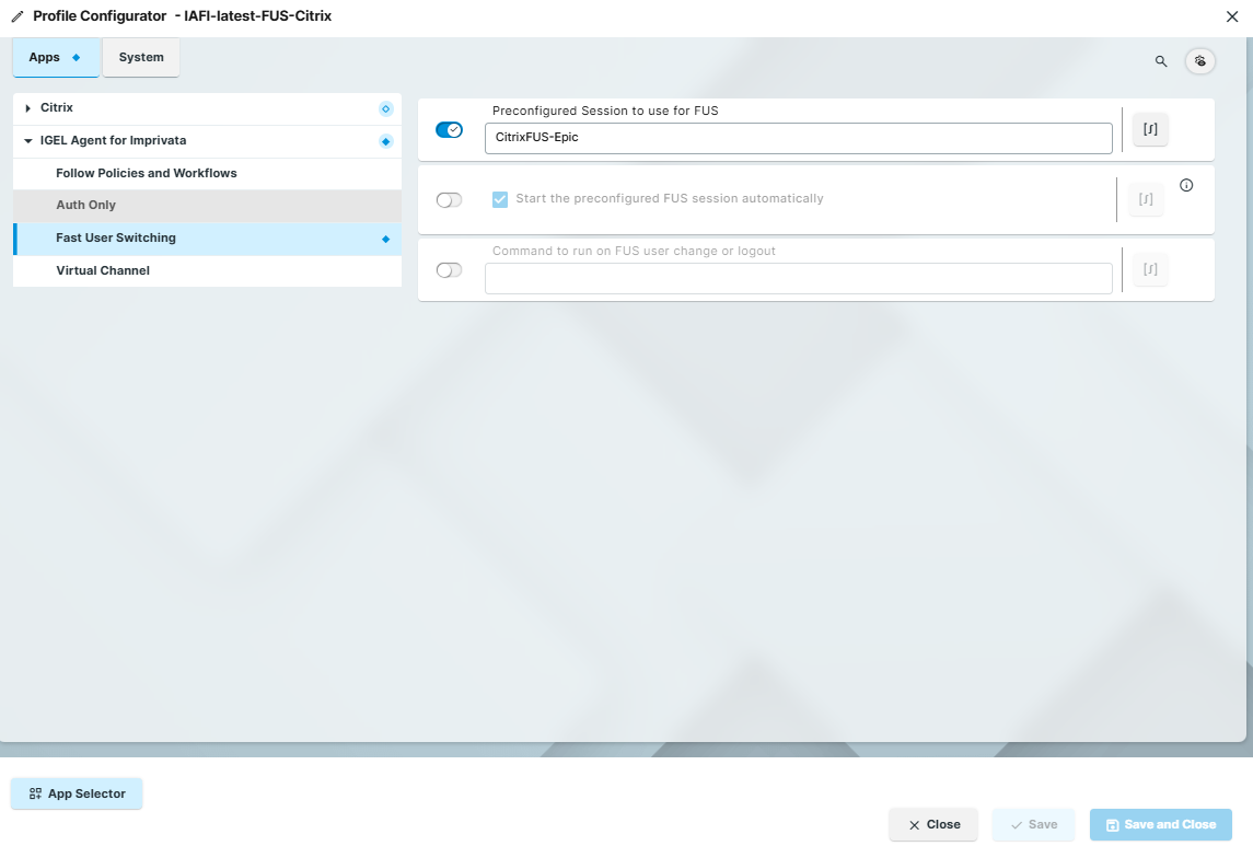 In the profile configurator, go to Apps > IGEL Agent for Imprivata > Fast User Switching.