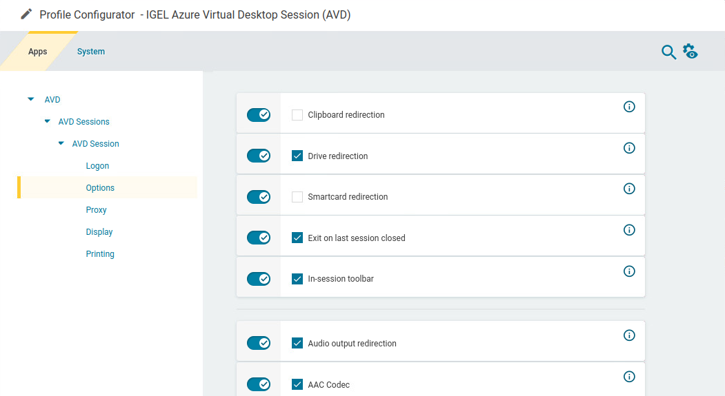 In the profile configurator, go to Apps > AVD > AVD Sessions > [session name] > Options.