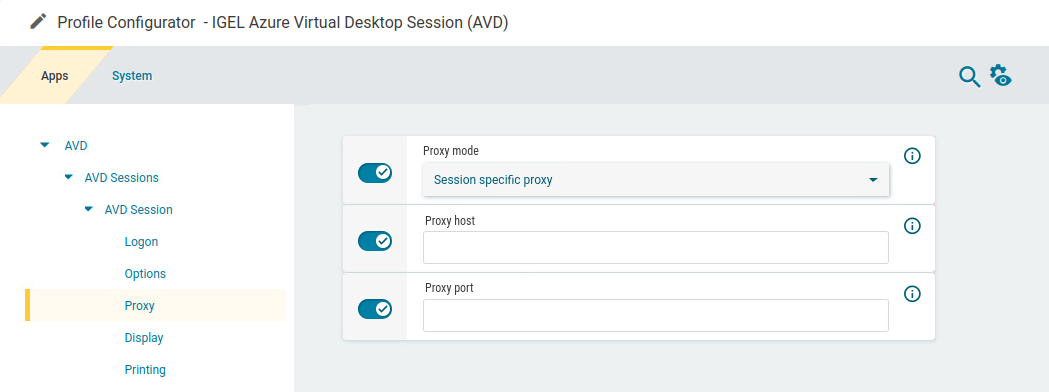 In the profile configurator, go to Apps > AVD > AVD Sessions > [session name] > Proxy.