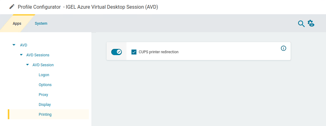 In the profile configurator, go to Apps > AVD > AVD Sessions > [session name] > Printing.