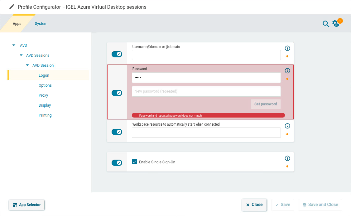 In the profile configurator, go to Apps > AVD > AVD Sessions > [session name] > Logon.