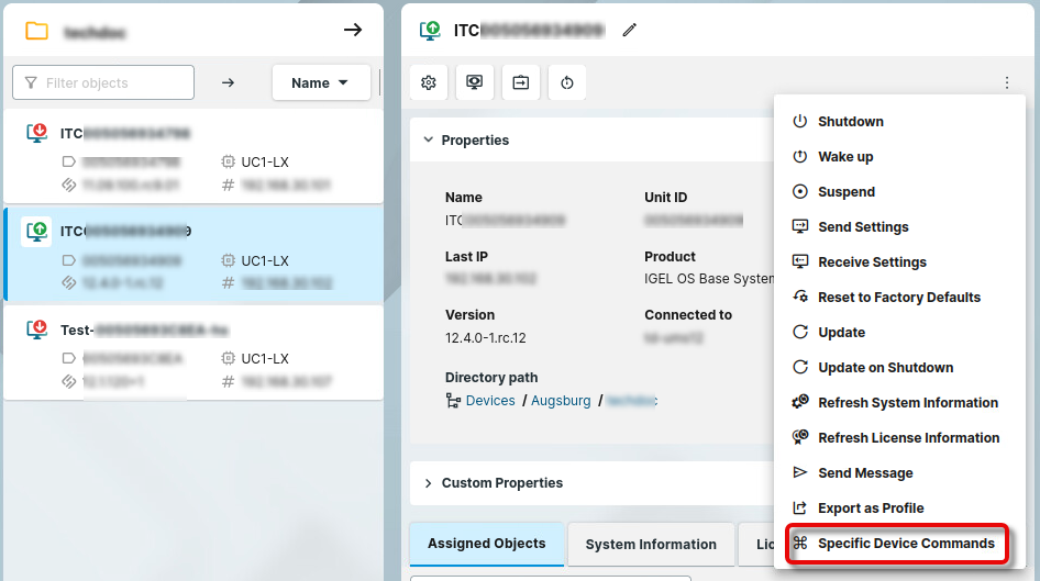 In the UMS, select the relevant devices (or directory), open the context menu, and select Specific Device Command