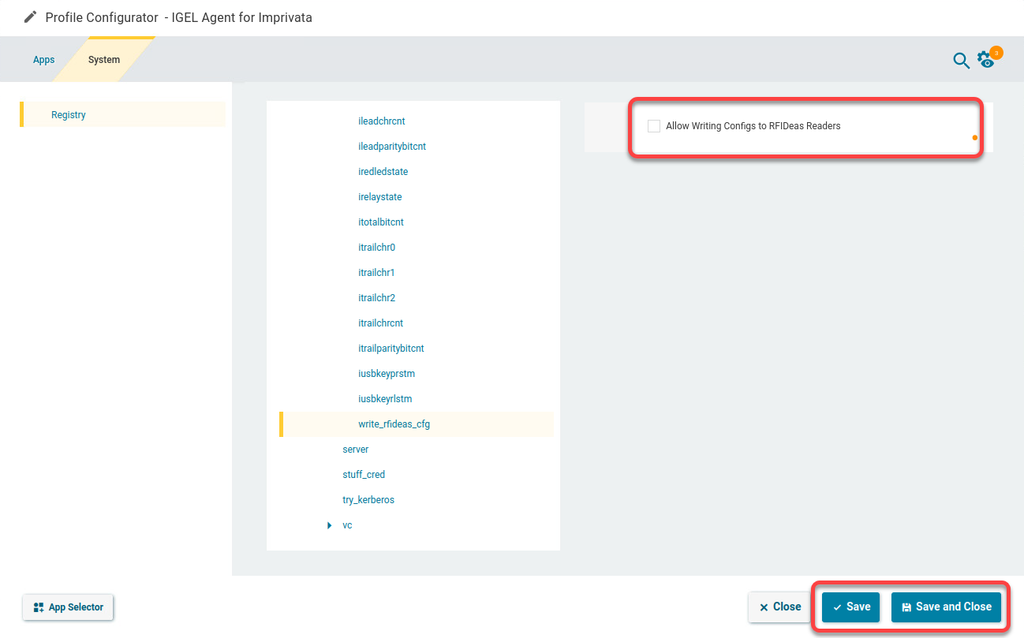 → In the profile configurator, go to Registry > app > iia > rfideas > write_rfideas_cfg, deactivate Allow writing configs to RFIDeas readers, and save your settings.