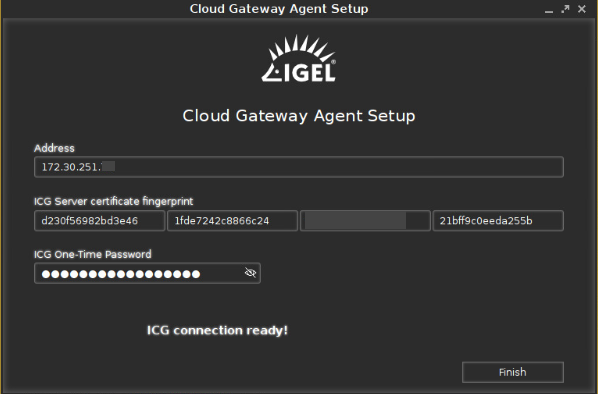 The ICG Agent Setup, which is described here, is embedded in the Setup Assistant. The procedure is identical both for the standalone ICG Agent Setup (can be configured in IGEL Setup > Accessories > IGEL OS > Versions of IGEL OS > (11.09.310-en) IGEL OS > (11.09.310-en) IGEL OS Reference Manual > (11.09.310-en) Accessories > (11.09.310-en) ICG Agent Setup > (11.09.310-en) Using ICG Agent Setup) and the one embedded in the Setup Assistant. For more information on the Setup Assistant in IGEL OS 11, see the IGEL OS > Versions of IGEL OS > (11.09.310-en) IGEL OS > (11.09.310-en) IGEL OS Reference Manual > (11.09.310-en) Setup Assistant for IGEL OS chapter in the IGEL OS manual.