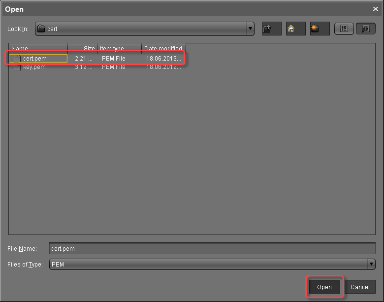 to import the root certificate.Choose the CA's root certificate file (PEM format) and click Open.
