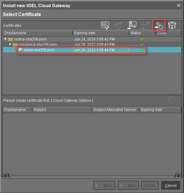 To make sure that your certificates can be used by your IGEL Cloud Gateway installation, see Certificate Requirements and Recommendations for the IGEL Cloud Gateway (ICG).