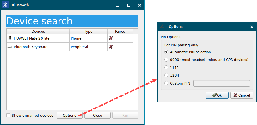 Custom PIN: Pairing with a fixed PIN entered by the user.