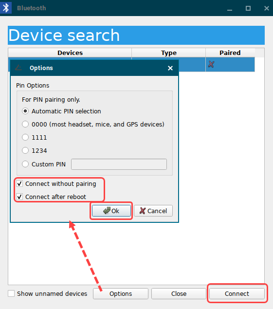 Under Options, enable Connect without pairing and, if required, Connect after reboot.