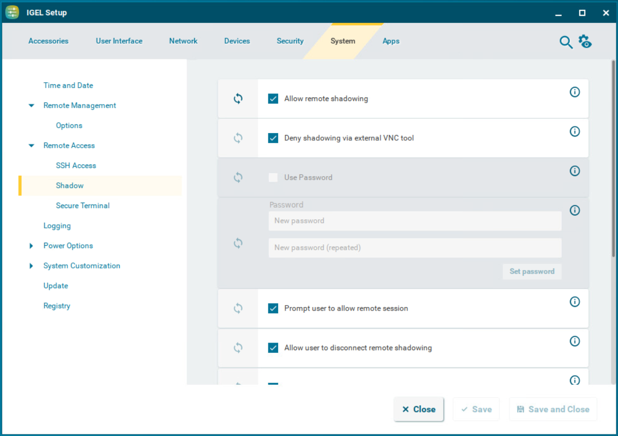 ☑ The device can only be shadowed via the UMS. Shadowing of the device by an external VNC viewer is not possible. For details, see Universal Management Suite > UMS Reference Manual > Devices - Managing Devices in the IGEL UMS > Shadowing - Observe IGEL OS Desktop via VNC > External VNC Viewer. (Default)