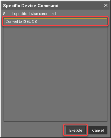 1. In the Specific Device Command dialog, select Convert to IGEL OS and click Execute.