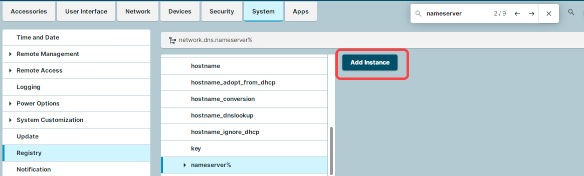 1. Search for nameserver with the Include Registry enabled or navigate to System > Registry > network.dns.nameserver%
